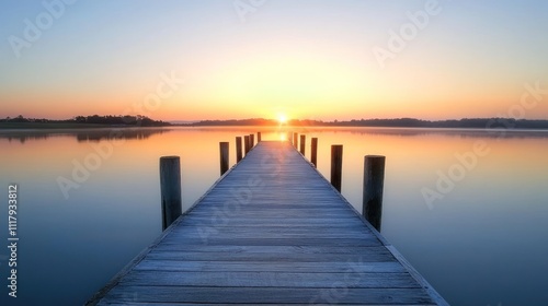 A serene sunrise over a calm lake, viewed from a wooden dock extending into the water.