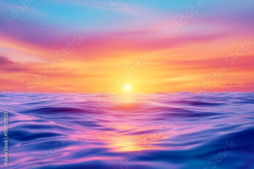 A serene sunset over a calm ocean, with soft waves and glowing clouds. Generative AI