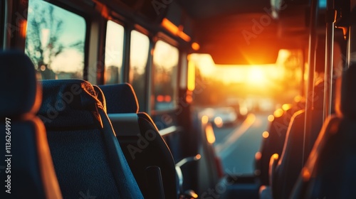 A serene sunset view from inside a bus, highlighting empty seats and a warm glow illuminating the scene.