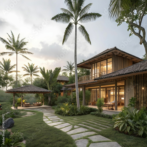 A serene tropical villa blending luxury with nature, featuring bamboo accents.