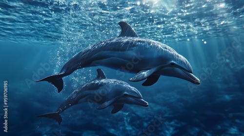 A serene underwater scene featuring two dolphins gracefully swimming together in clear blue waters, capturing the beauty of marine life and tranquility.
