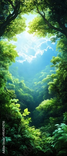 A serene view of lush greenery with sunlight filtering through the trees, creating a tranquil forest atmosphere.