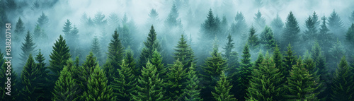 A serene view of misty evergreen trees in a dense forest, with fog rolling through the treetops, creating a tranquil and mysterious atmosphere.