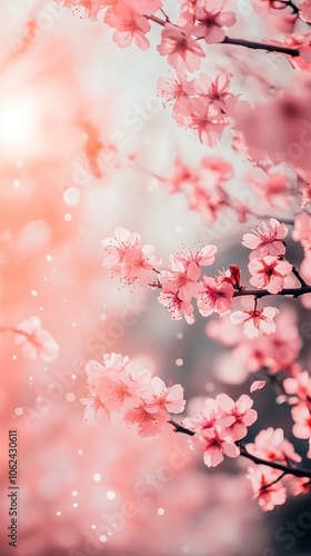 A serene view of soft pink cherry blossoms in full bloom, cascading from the branches. The delicate petals flutter gently in the breeze, creating a peaceful and picturesque scene of springtime beauty.