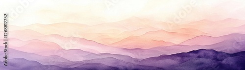 A serene watercolor landscape showcasing layered mountains in soft pastel shades of purple and pink, blending harmoniously into the horizon.