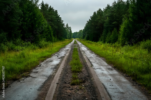 A serene, wet road surrounded by lush greenery under a cloudy sky, perfect for evoking feelings of solitude and exploration.