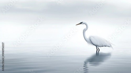 A serene white heron stands gracefully in calm waters under a misty sky.