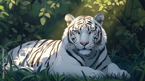 tiger, white, animal, wildlife, forest, nature, jungle, beauty, serene, resting, sunlight, leaf, greenery, habitat, predator, big cat, stripes, calm, majestic, environment, wild, portrait, peaceful, ecosystem, fauna, endangered, paw, whisker, eye, fur, landscape, shadow, calmness, observation, natural, art, illustration, high-coloured, colours, detail, flora, resting place