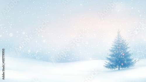 A serene winter landscape featuring a snow-covered ground, falling snowflakes, and a solitary evergreen tree.