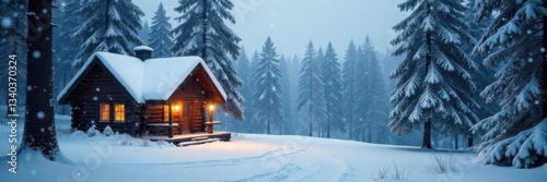 A serene winter scene features snowflakes gently falling on a peaceful cabin, surrounded by towering pine trees and the quiet woods, snow covered trees, snowfall