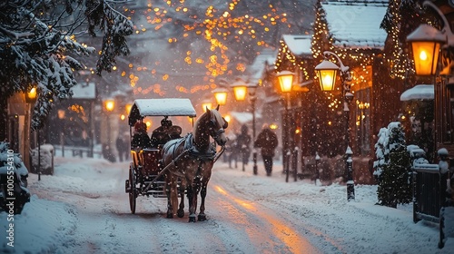 winter, carriage, snow, horse, street, lantern, light, snowfall, festive, evening, idylli, heritage, dreamlike, landscape, rustic, cosy, beauty, leisure, holiday, seasonal, respect, historic, adventure, rural, calmness, tradition, scenery, warm, journey, picturesque, village, delicate, ambience, serene, nostalgia, equestrian, architecture, magical, atmosphere, snowy, travel, nature, romance, horizon, transport, twilight, environment