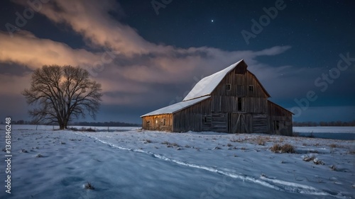 barn, winter, snow, night, star, tree, landscape, rustic, countryside, serene, peaceful, cloud, cold, nature, agriculture, rural, sky, scenery, calmness, wood, architecture, beauty, illumination, path, outdoors, environment, horizon, dusk, twilight, atmosphere, scenic, field, frost, seasonal, weather, evening, solitude, calm, dark, light, heritage, farming, stillness, quiet, shadow, nightscape, wintery