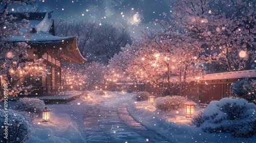winter, snow, cherry, blossom, lantern, pathway, night, serene, landscape, tree, light, garden, peaceful, nature, architecture, beauty, calmness, moon, sky, cold, atmosphere, scenery, illumination, season, magic, culture, tradition, harmony, charme, picturesque, view, elegance, stillness, ambience, warmth, cosy, environment, art, aesthetic, visual, romance, escape, dream, quiet, wonder, serenity