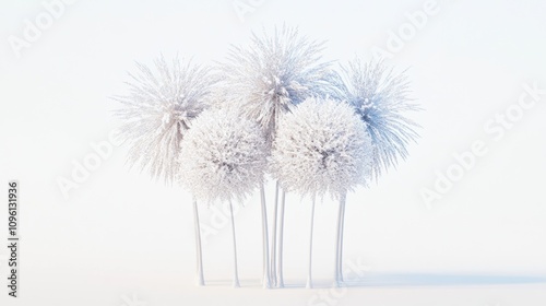 A serene winter scene featuring stylized, snow-covered trees.