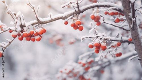 A serene winter scene where red berries and tree branches are delicately frosted with white snow and ice crystals, highlighting the cold beauty of nature