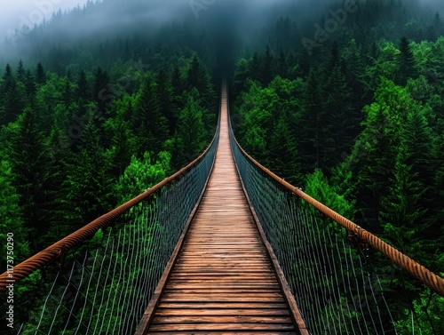 A serene wooden bridge stretches through a lush green forest, shrouded in mist, inviting exploration and adventure.