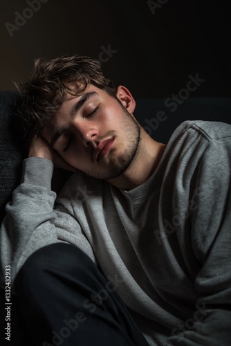 sleeping, young, man, couch, soft, lighting, serene, relax, peace, calm, comfort, emotion, thought, calmness, intimacy, portrait, beauty, serenity, dream, relaxation, modern, expression, youth, coiffure, closeup, solitude, tenderness, peacefulness, contentment, leisure, casual attire, lifestyle, moody, artistic, shadow, warmth, indoor, night, quiet