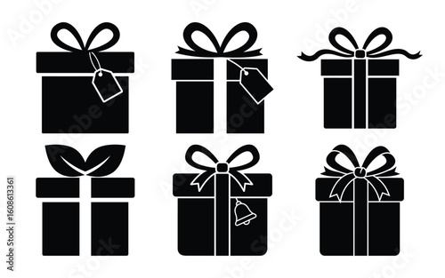 A series of black gift box silhouettes isolated on white background, each uniquely adorned with ribbons, bows, and tags, ideal for festive projects