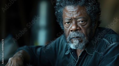 A serious African American man with gray hair and beard is gesturing. He is wearing a dark shirt, and the background is out of focus, emphasizing his thoughtful expression.