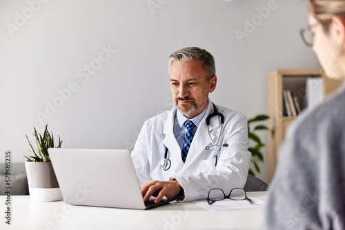 A serious male doctor is typing a prescription for medication over the laptop.