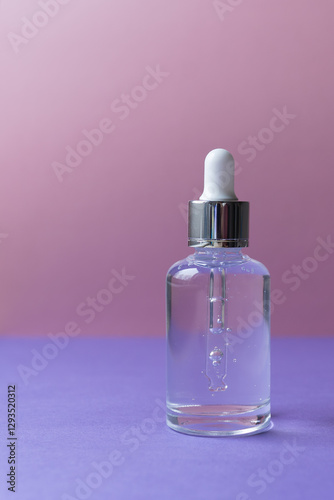 A serum bottle, set on a gentle pink backdrop, creating an upscale atmosphere. Ideal for beauty product advertisements, emphasizing the luxury and effectiveness of skincare.