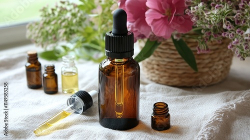 A serum bottle with a dropper on a linen cloth, alongside essential oils and small glass jars.