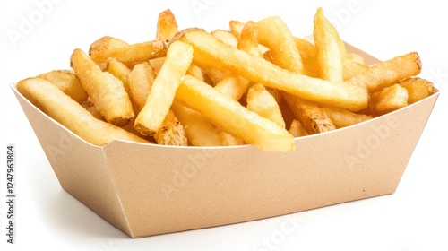 A serving of French fries in a paper container, isolated from background, with crisp details