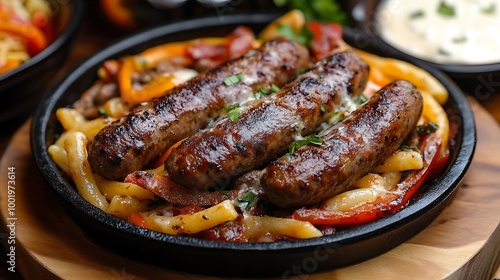 A serving of Italian sausage and peppers, served on a bed of pasta with marinara sauce.