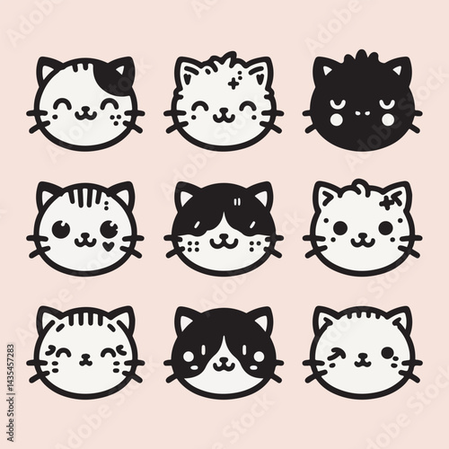 A set of cute cat face icons with different expressions and fur patterns
