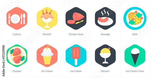 A set of 10 mix icons as cutlery, dessert, chicken slice