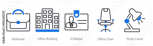 A set of 5 Office icons as briefcase, office building, id badge