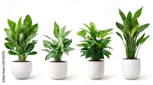 A set of air-purifying plants, including peace lily, snake plant, and bamboo palm, placed on a white background.