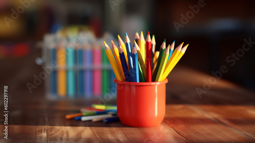 A set of colouring pencils on a desk with an out of focus classroom background. A.I. generated.