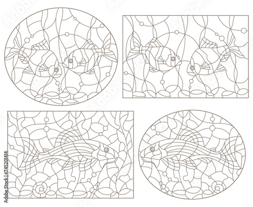 A set of contour illustrations of stained glass windows with aquarium fish barbuses and catfish, dark contours on a white background