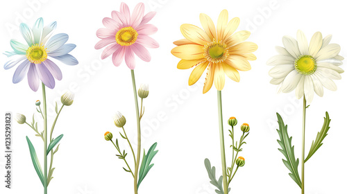 A set of daisy bouquets in pastel colors, isolated on a white background
