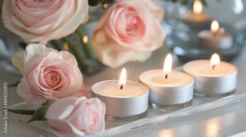 A set of delicately scented tealight candles each emitting a soft glow and a gentle fragrance to enhance the mood of any room.