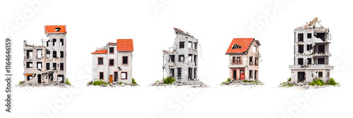 A set of destroyed post-apocalyptic houses in different stages isolated on a white background