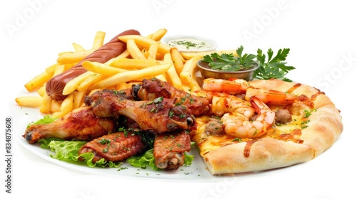 fast food, isolated, white background, french fries, chicken wings, pizza, hot dog, realistic, photo, variety, assortment, delicious, meal, junk food, snack, indulgence, take-out, convenience, greasy, fried, savoury, appetising, unhealthy, culinary, cookery, comfort food, tasty, mouth-watering, crispy, breaded, sauce, dipping, condiment, fried food, mealtime, ready-to-eat