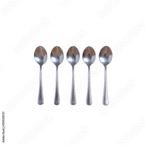 A set of five stainless steel soup spoons neatly arranged on a white background. Ideal for kitchen and dining projects, showcasing utensil design and functionality.
