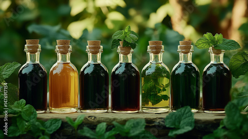 A set of glass bottles with Shaman's Balsamic clinging oil and vinegar, oregano and lemon balm, mint leaf, honey, and black pepper, on a natural background.