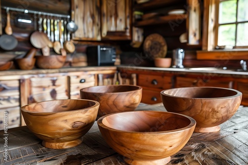 A set of handcrafted wooden bowls with a background of a rustic cabin kitchen