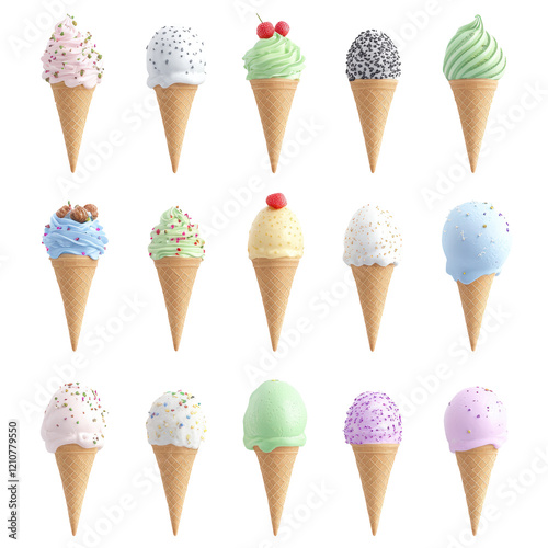 A set of ice cream cones with various flavors and toppings, isolated on a white background. Concept: summer dessert, sweet indulgence