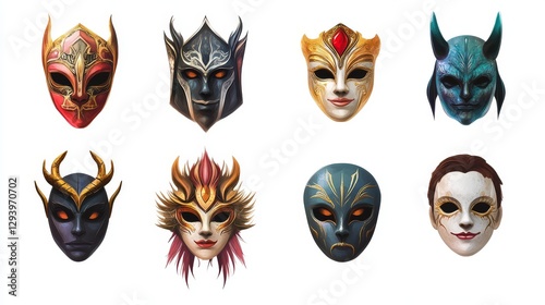 mask, icon, set, game, isolated, white, background, fantasy, mystery, disguise, costume, carnival, masquerade, theatre, rpg, interface, character, adventure, strategy, collectable, mystical, enchanted, tribal, ancient, ceremonial, supernatural, folklore, mythology, warrior, shaman, ritual, symbolic, ornate, decorative, eerie, horror, villain, hero, expression, emotion, hidden, secret, anonymity, identity, mysterious