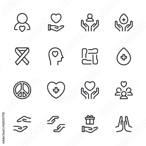 set, icon, peace, symbol, health, wellness, vector, hand, support, people, giving, illustration, design, care, volunteer, help, charity, outline, community, assistance, line, isolated, hope, sharing, business, protection, aid, service, abstract, love, human, signs, humanitarian, family, white, concept, background, holding, donate, ribbon, blood, solidarity, social, silhouette, nubes, money, food, togetherness, children