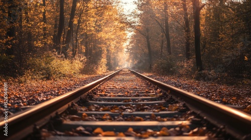 A set of railroad tracks running through a forest, with autumn leaves scattered along the path, bathed in warm sunlight