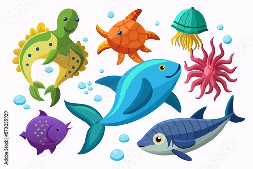 fish, sea, cartoon, animal, vector, ocean, set, octopus, water, illustration, animal, aquarium, dolphin, starfish, marin, shark, underwater, nature, tropical, crab, jellyfish, baby, turtle, whale, collection