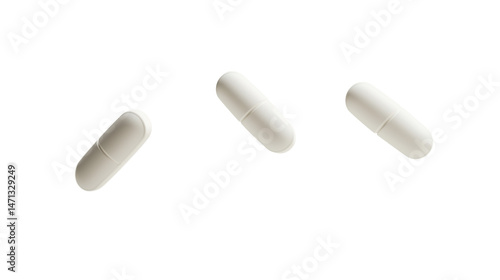 A set of three white pills suspended in mid-air, set against a clean white background, ideal for healthcare visuals isolated on a transparent background
