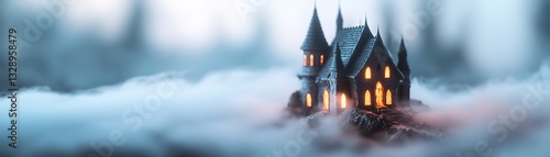 A shadowy silhouette of an ancient castle rises from swirling mist, with glowing windows illuminating the twilight hues. This mystical scene invites imagination and curiosity