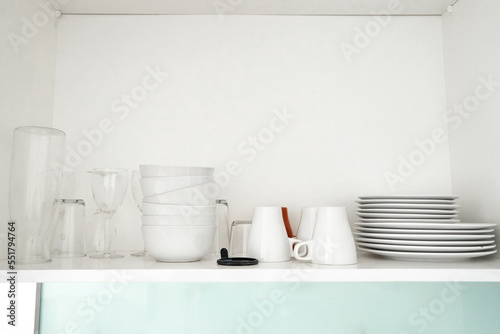 dish, plate, kitchen, shelf, cupboard, white, cup, clean, crockery, set, glasses, kitchen utensile, ceramic, utensil, dinnerware, group, bowl, home, interior, tableware, porcelain, crockery, background, inside, open, closeup, saucer, glassware, cookery, different, domestic, indoor, dining, storage, serving, furniture, cabinet, colours, modern, object, food, cooking, design, concept, prepare, light, stack, mug, apartment
