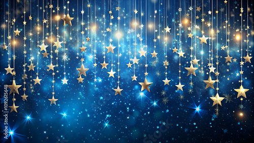 A shimmering blue background filled with golden stars hanging delicately, creating a magical and enchanting atmosphere.